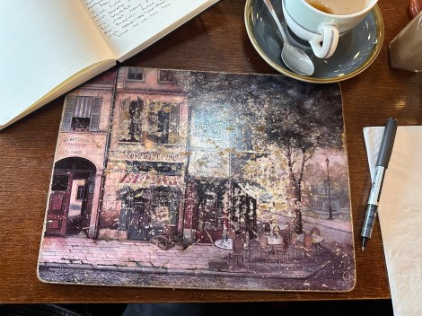 Looking up from possibly the worst poached egg in the world—white bread, watery egg, a lettuce leaf, a cold tomato slice—I notice the mat my breakfast debris rests on. Its pallor contrasts sharply with the dawn (or sunset) implied by the rest of the interior. It depicts a French village street scene in a longing, faded Wes Anderson gouache style, probably painted in the 1980s, worn down by thousands of unsatisfied hands. All the placemats in the café are the same. When I was young, I always wondered why placemats sold together were always identical. Surely that was a missed opportunity. This small, strange experience probably foretold a suspicious relationship to pictures generally: sequential monotony, missed chances to display original art, and so on. I avoid the obvious fantasising about who this anonymous artist is or was.